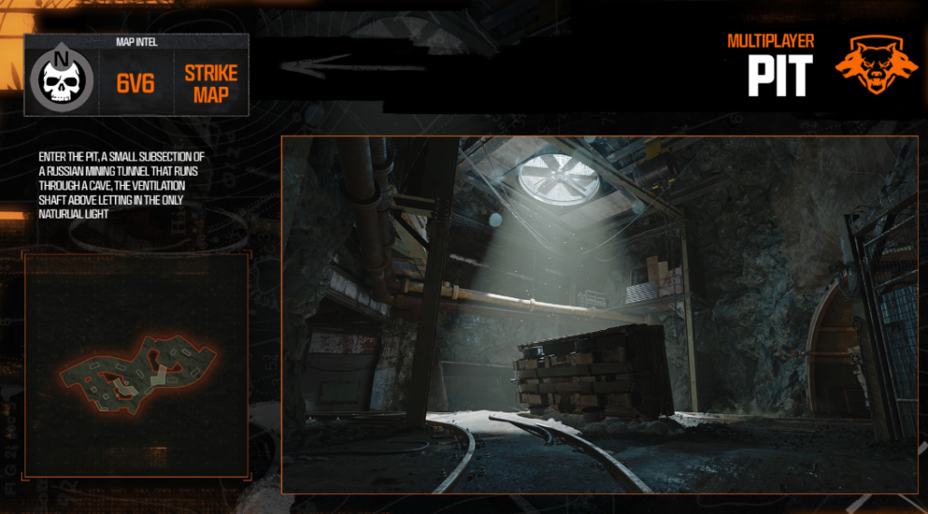 The Pit map is dark and gritty, and it has many places to hide. It takes players deep into a small section of a Russian mining tunnel. The only natural light filter is a ventilation shaft running overhead, casting shadows across the rugged terrain. Players spawn near overturned mine carts that lead straight to the heart of the action.