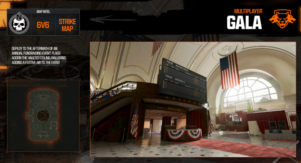 In contrast, the Gala map offers a drastically uplifting setting. It takes place inside a lavish building with a fundraising event, complete with American flags draped from the ceiling and great lighting. Despite its upscale appearance, Gala is just as compact as Pit, guaranteeing fierce, close-quarters combat, taking full advantage of Black Ops 6’s new Omnimovement system. Together with the Stakeout map from the first weekend, Pit and Gala complete the lineup of eight maps available in the Black Ops 6 beta.