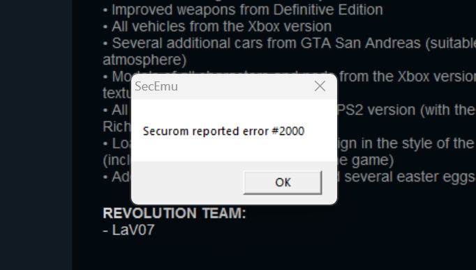 Some users might encounter a Secorum #2000 Error when clicking play. This error is very simple to resolve and can be fixed in under a minute. Follow the steps below if you are also experiencing the Secorum #2000 error while launching GTA Vice City Nextgen Edition Mod: